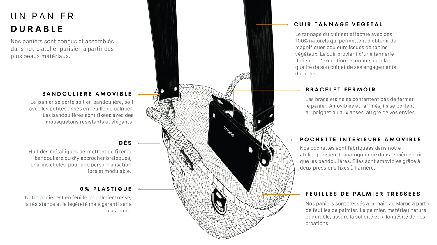 Découvrez notre collection de paniers bandoulières en feuilles de palmiers et cuir à porter toute l’année et en toutes occasions dans une démarche éco-responsable